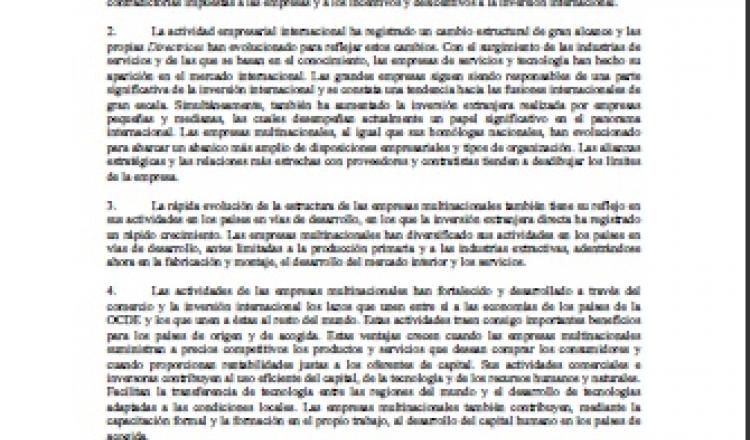 Las Líneas Directrices de la OCDE para Empresas Multinacionales (en adelante, lasDirectrices) son recomendaciones dirigidas por los gobiernos a las empresas multinacionales. Enuncianprincipios y normas voluntarias para una conducta empresarial responsable compatible con laslegislaciones aplicables. La vocación de las Directrices es garantizar que las actividades de esas empresasse desarrollen en armonía con las políticas públicas, fortalecer la base de confianza mutua entre lasempresas y las sociedades en las que desarrollan su actividad, contribuir a mejorar el clima para lainversión extranjera y potenciar la contribución de las empresas multinacionales al desarrollo sostenible.Las Directrices forman parte de la Declaración de la OCDE sobre Inversión Internacional y EmpresasMultinacionales, cuyos restantes elementos se refieren al tratamiento nacional, a las obligacionescontradictorias impuestas a las empresas y a los incentivos y desicentivos a la inversión internacional.
